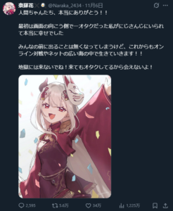 2025年11月9日ににじさんじを卒業したVtuberの奈羅花さん。