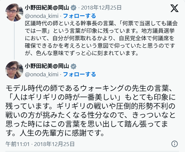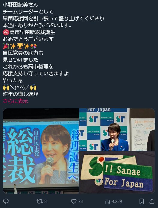 小野田紀美議員の今後の活躍からはますます目が離せません。高市早苗総裁とどのような政治をしていくのか楽しみに応援していきたいですね。