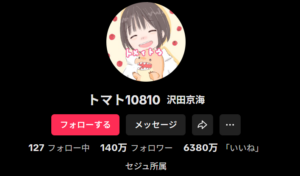 | SNS・プラットフォーム | TikTokアカウント:@tomato10810 (フォロワー数100万人超) |