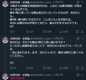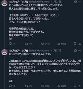 - 「まだ朝7時に通勤してるんですか?」から始まり、「それって『何より大事なもの』を失っていますよ」投稿。