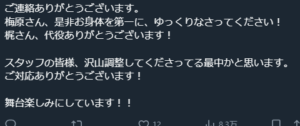 一方で、Xを見るとファンの方は今回の体調不良によるREADING HIGH『ONE ~The last of 新選組~』の降板については応援するという肯定的な意見の方が多いようでした!